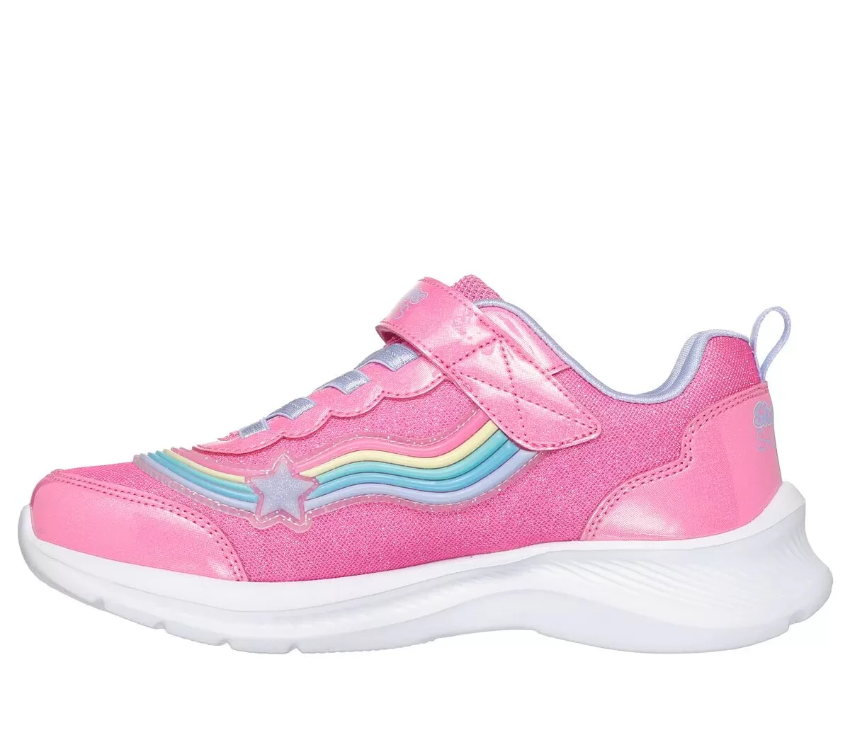 Skin lysere med hvert skridt iført Skechers Jumpsters 2.0. Dette Skechers adaptive lukningsdesign har en skinnende mesh og syntetisk overdel med oplyste stjerneformede bits, stræksnørebånd, en krog-og-løkke-vristrem og en polstret komfort-indlægssål.