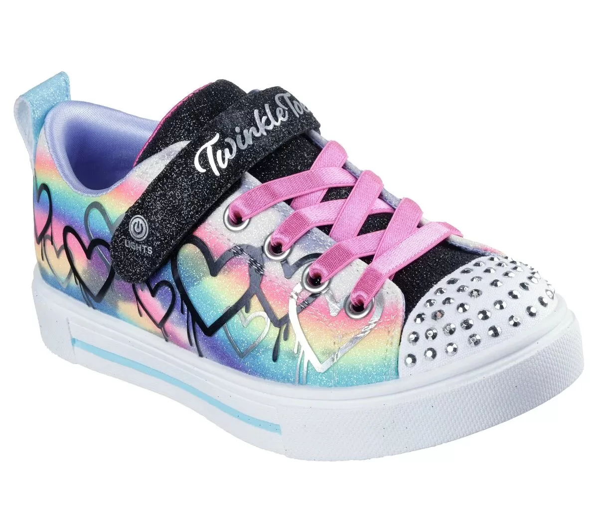 Lys legepladsen op med hjertefyldt stil iført Skechers Twinkle Toes®: Twinkle Sparks – Ombre Love. Denne sjove oplyste sneaker har en metallisk overdel i stof med drop-hjerteprint med glitterkanter, satin-stræksnørebånd, justerbar vristrem og en oplyst rhinstensudsmykket tå.