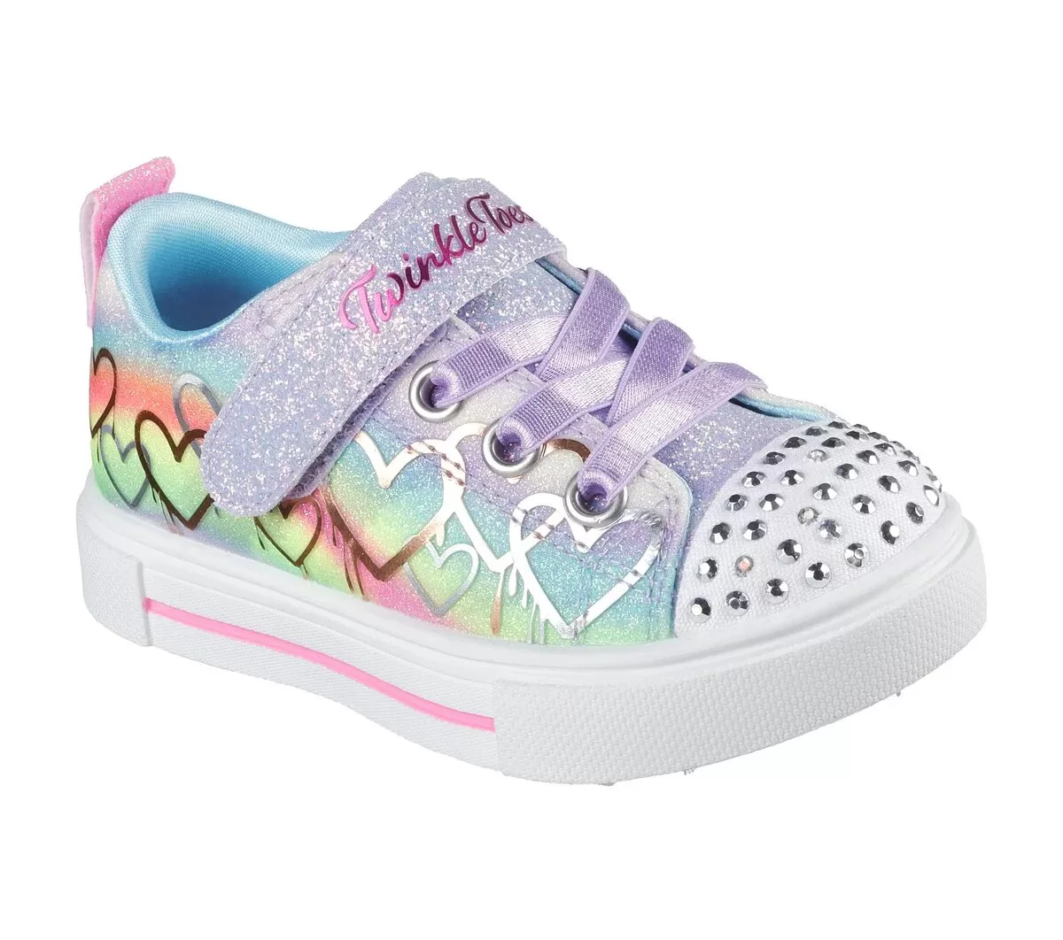 Lys legepladsen op med hjertefyldt stil iført Skechers Twinkle Toes®: Twinkle Sparks – Ombre Love. Denne sjove oplyste sneaker har en metallisk overdel af stof med drop-hjerteprint med glitterkant, satinsnørebånd, justerbar vristrem og en oplyst rhinstensudsmykket tå.