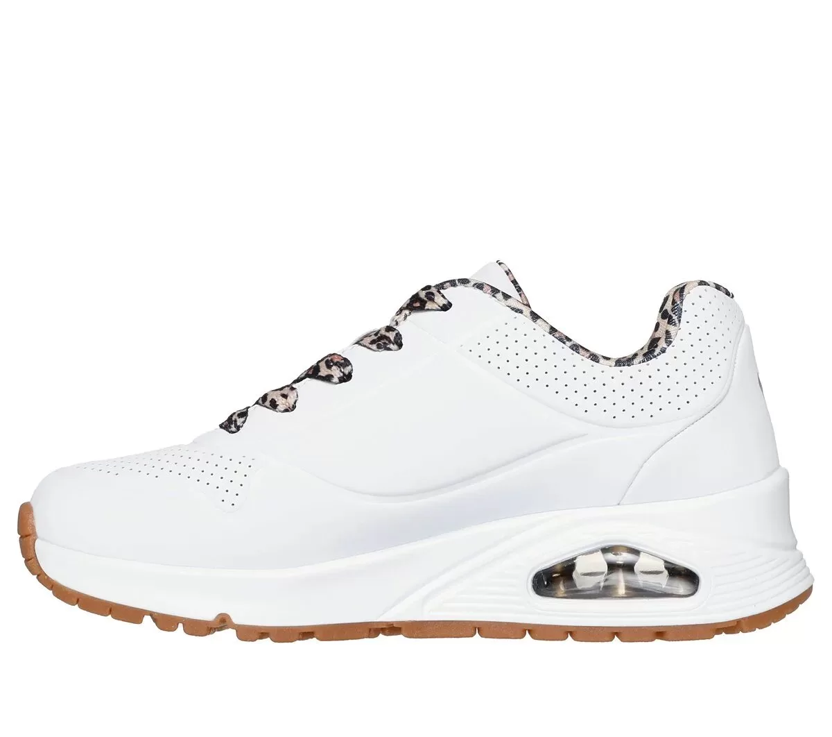 Følg dine stilinstinkter iført Skechers Street™ Uno Gen1 – Leopard Chic. Denne modesneaker med snøre har en syntetisk, perforeret durabuck-overdel med leopardprint, et andet sæt snørebånd, Skech-Air® synlig airbag i mellemsålen og en polstret Skechers Air-Cooled Memory Foam® indersål.