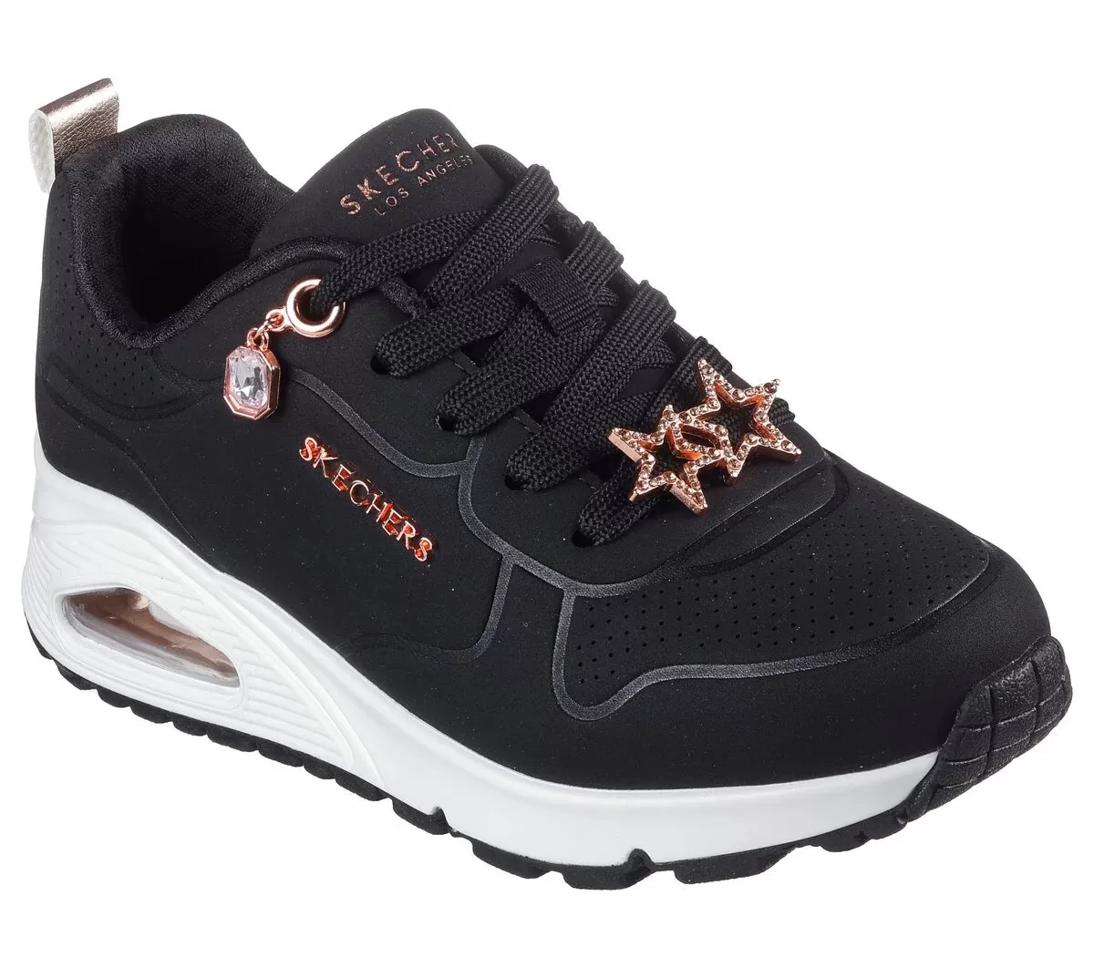 Niveau dit sneakerspil med polstret komfort iført Skechers Street™ Uno Gen1 – Trendy Jewels. Denne modesneaker med snøre har en præget durabuck-overdel med charmedetalje, Skechers Air-Cooled Memory Foam®-komfort-indlægssål og en synlig Skech-Air®-airbag-mellemsål.