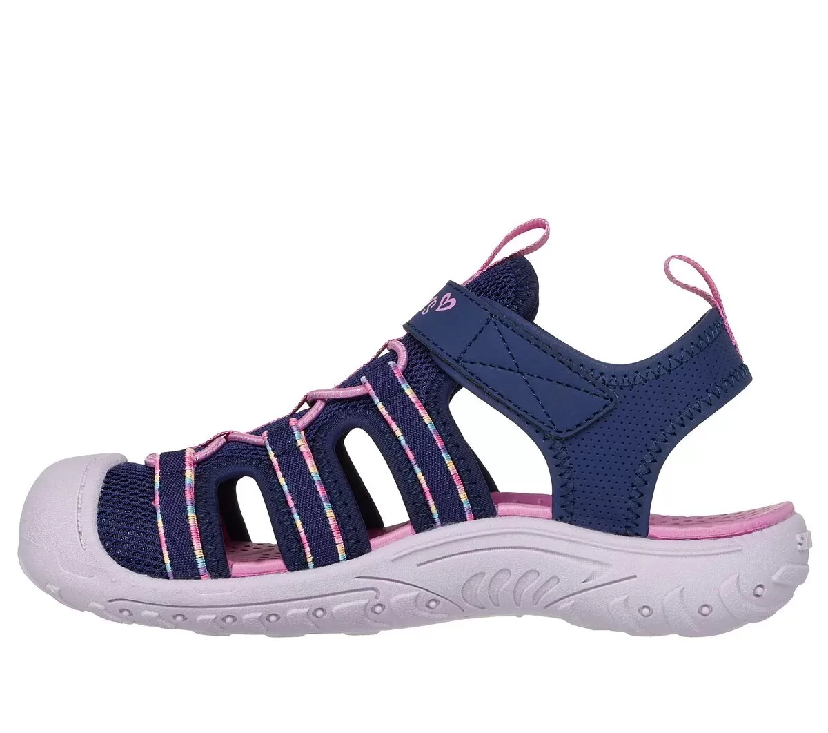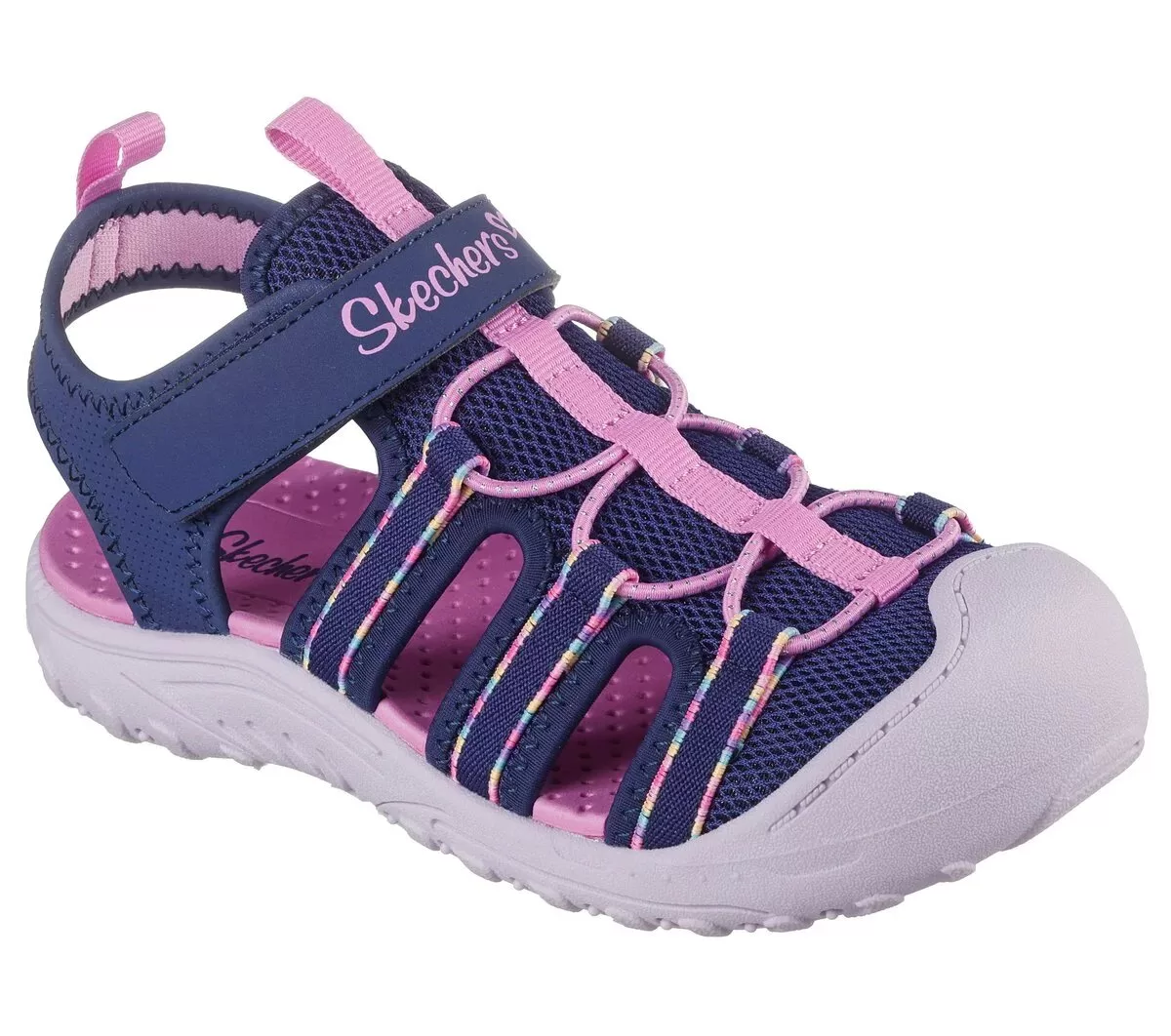 Lad eventyr være din guide iført Skechers Reggae Troop. Denne flodsandal med lukkede tåer har en overdel i mesh med en justerbar vristrem, stretch-blondedetalje og en forstærket syntetisk tåkappe for holdbarhed.