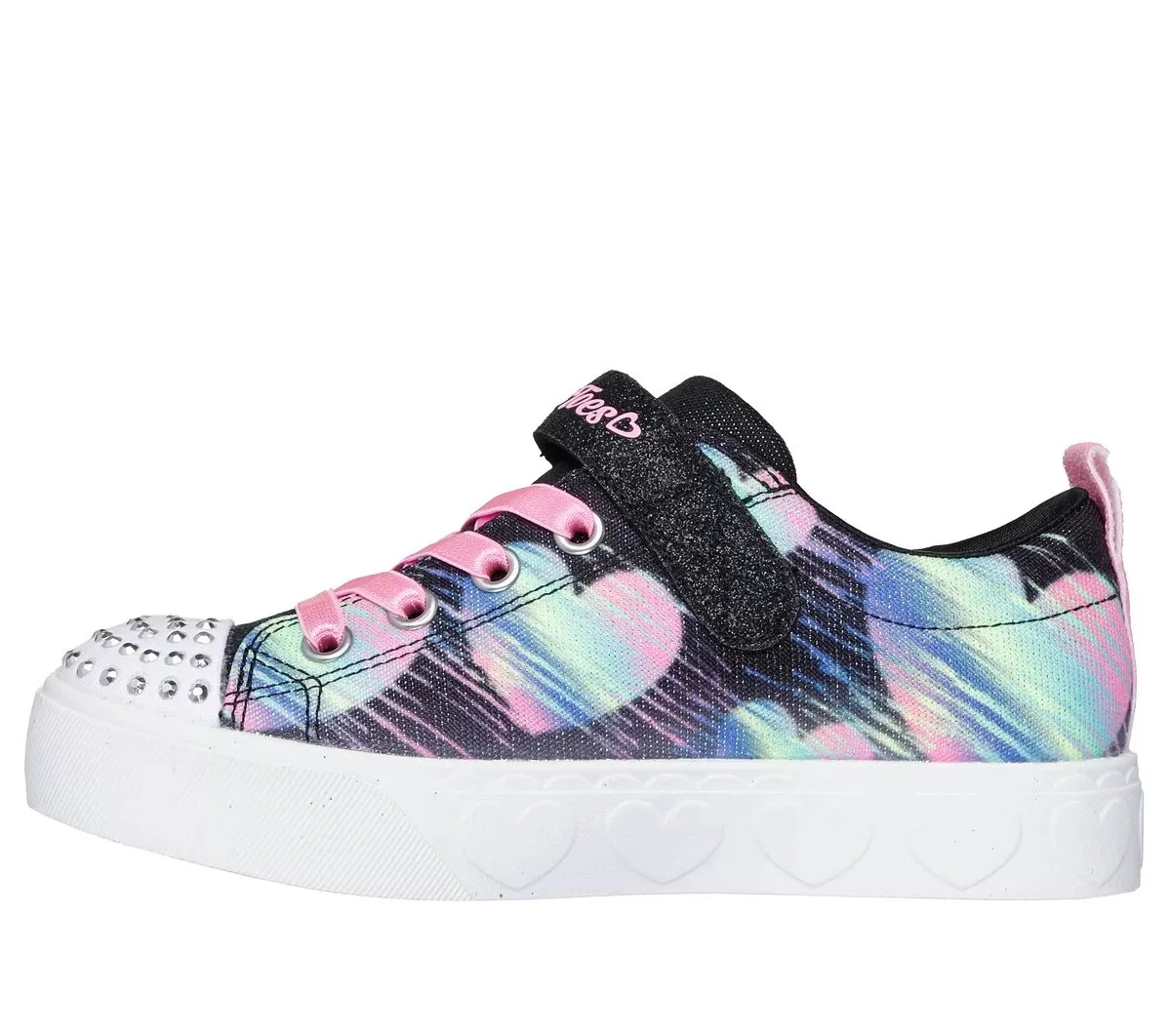 Lys alle rum op med kunstfærdig stil iført Skechers Twinkle Toes®: Heart Steps – Heart Sketch. Dette hjertetrimmede design har en overdel i skinnende stof med ‘hjerteskitse’-print, stræksnørebånd, justerbar vristrem og en lysende rhinsten-udsmykket tåkappe.