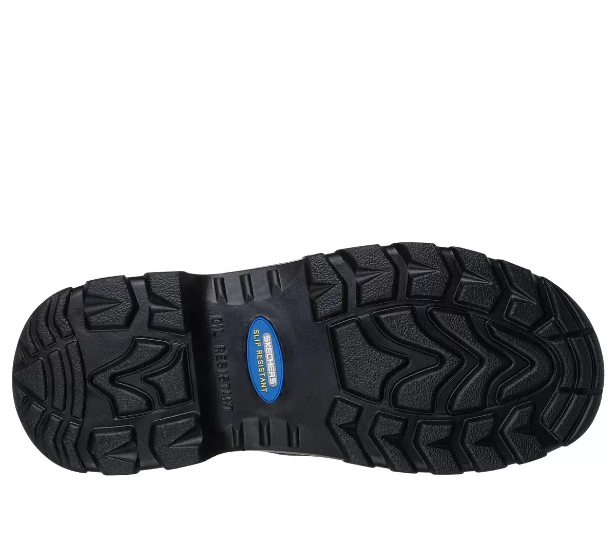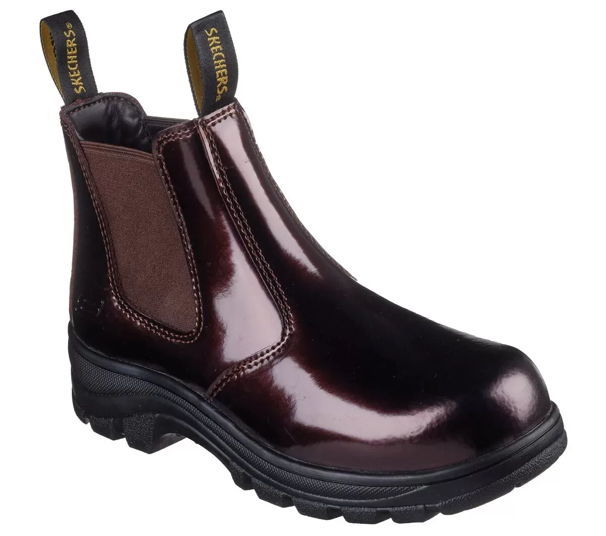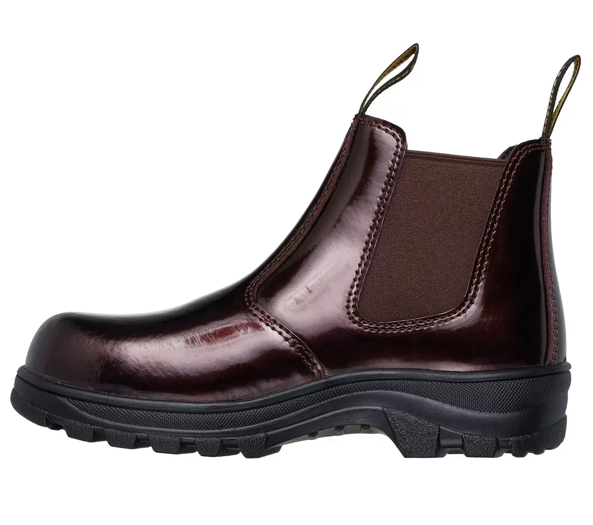 Arbejd dit skifte i moderigtig beskyttelse og komfort med Skechers Work™: Workshire – Sohlei. Denne pull-on Chelsea-støvle har en overdel i laklæder med dobbelte gore-paneler, en ikke-metallisk sammensat sikkerhedstå, skridsikker ydersål og en polstret Skechers Memory Foam™ indersål.