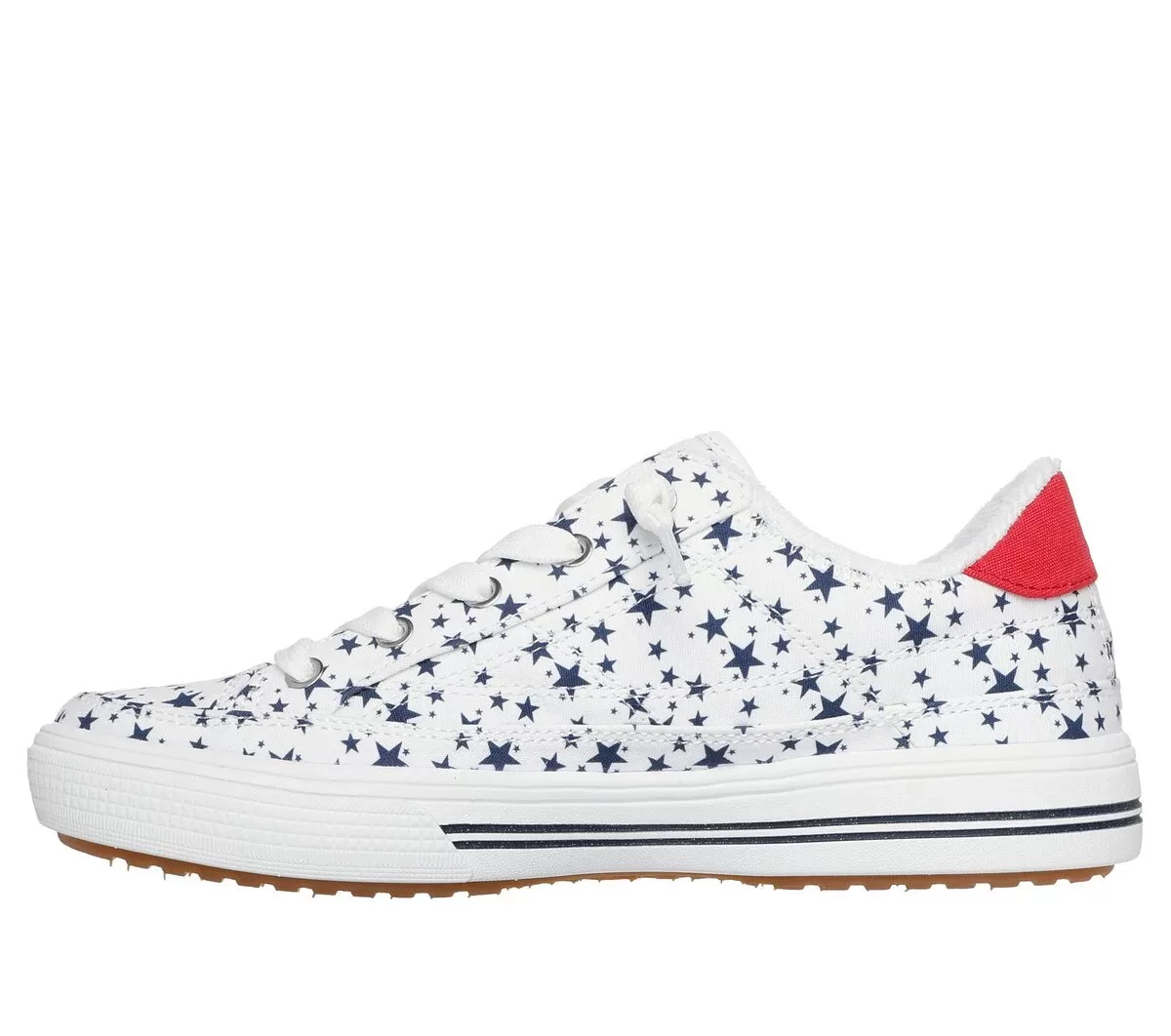 Sæt lidt stolthed i dit skridt med Skechers Street™ Arch Fit® Arcade – Born Free. Denne stjernebeklædte veganske stil er blevet tildelt APMA Seal of Acceptance og har en trykt lærredsoverdel med afbundne deco-snørebånd og en aftagelig Arch Fit® indersål.
