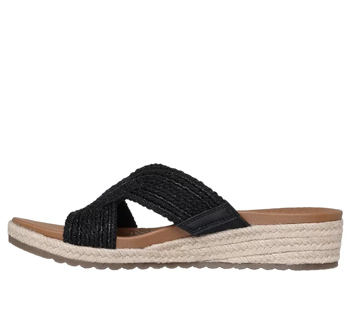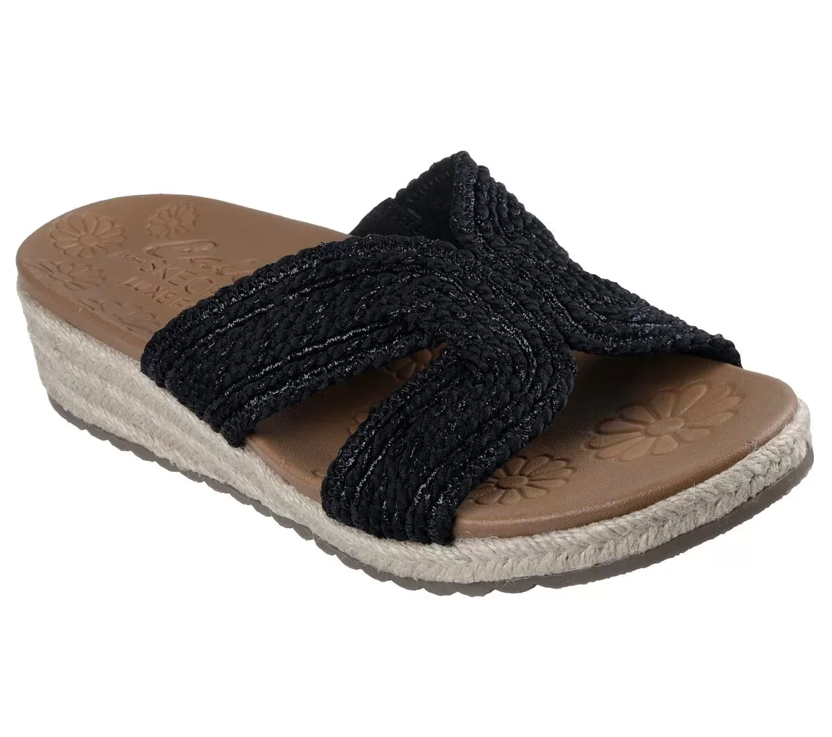 Sommerlig stil og førsteklasses komfort kombineres i Skechers Cali® Breezie – Shimmer Waves. Denne veganske kilesandal har en overdel med H-bånd i metallisk jute, en mellemsål i espadrille med jutekant og en polstret Luxe Foam® fodseng.