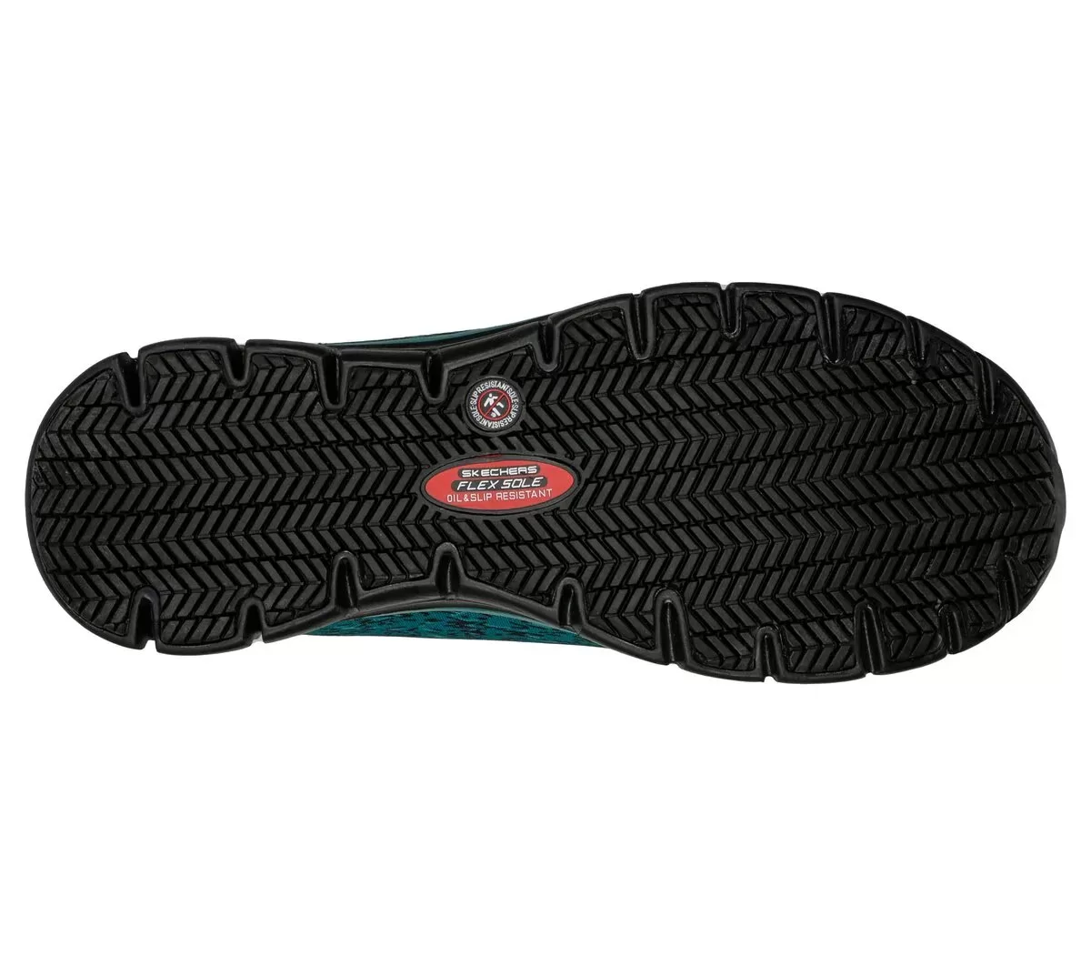 Vis din personlige stil i beskyttende komfort med Skechers Work™: Sure Track – Saivy. Denne snørebånd har et slidstærkt vævet stof og syntetisk overdel med en polstret Skechers Air-Cooled Memory Foam®-indlægssål, skridsikker ydersål og en letvægts-komposit-sikkerhedstå.