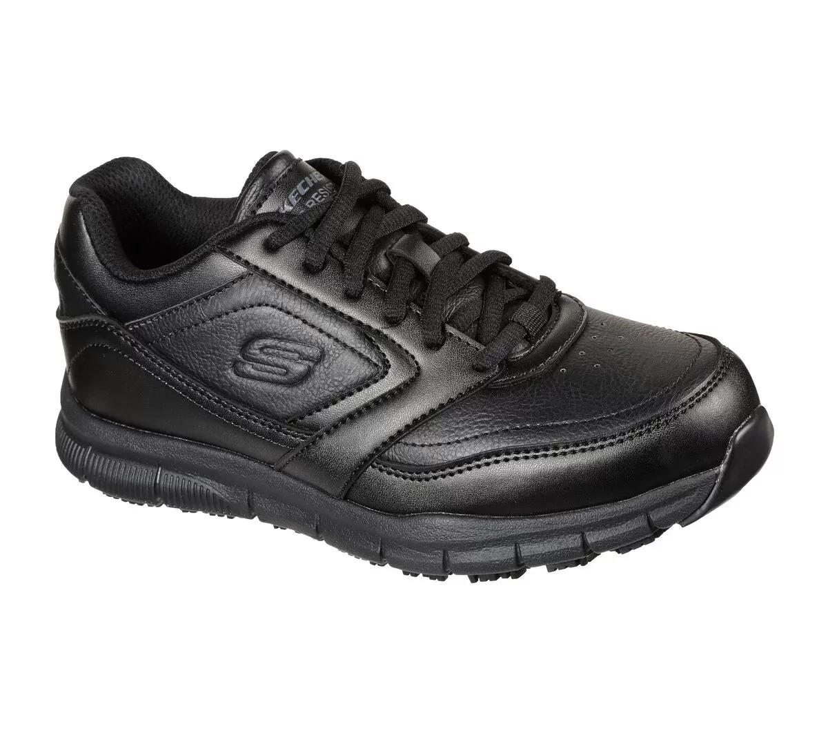 Sikker fodkomfort og sikkerhed kombineres i Skechers Work Relaxed Fit®: Nampa – Wyola SR. Dette skridsikre design har en glat syntetisk læderoverdel med snøre foran og en polstret Skechers Memory Foam™ indersål.