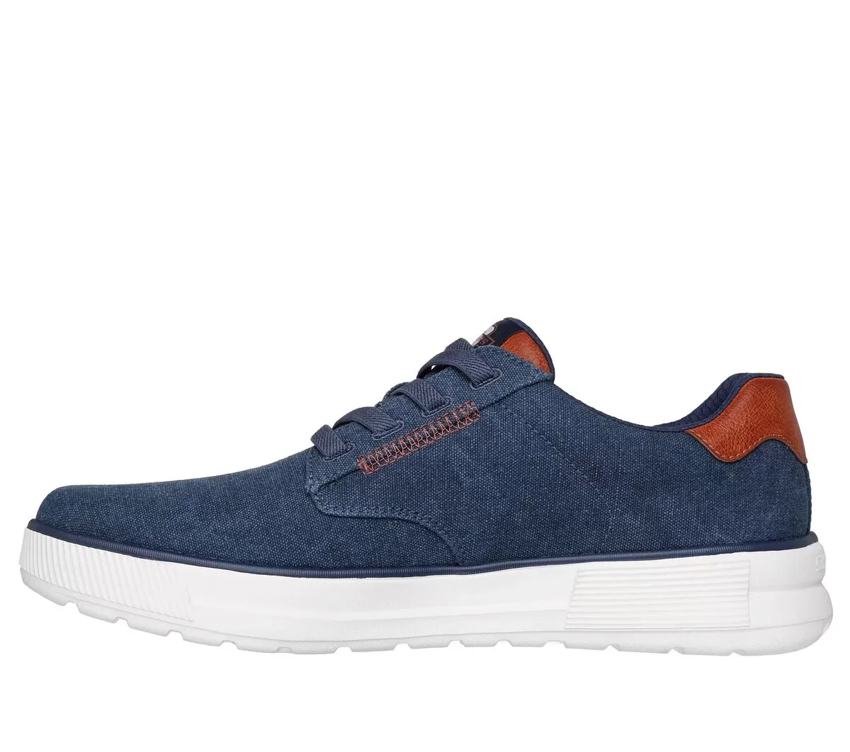 Gade-smart stil møder komfort hele dagen i Skechers Relaxed Fit®: Beckett – Jojo. Denne afslappede veganske stil har en lærredsoverdel med syntetisk læderdetalje, faste stræksnørebånd og en polstret Skechers Air-Cooled Memory Foam® indersål.
