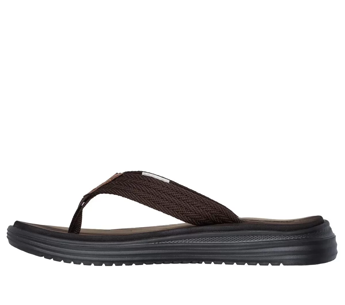 Bring sand, surf og sol frem i Skechers Relaxed Fit®: Proven SD – Korey. Denne rummelige 3-punkts string-sandal har en overdel med vævet svømmehud og en kontureret Luxe Foam® fodseng.