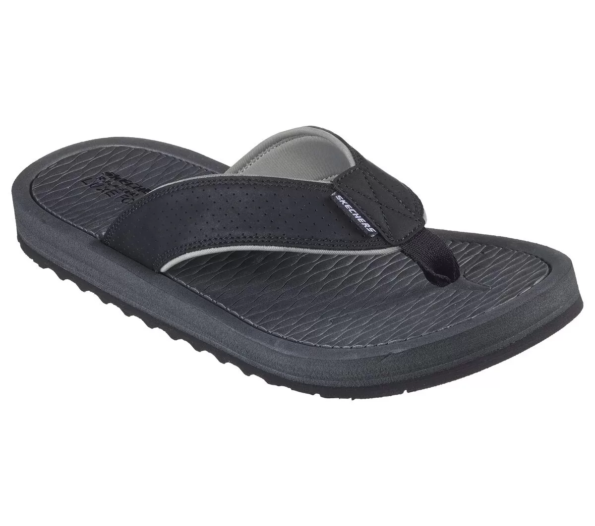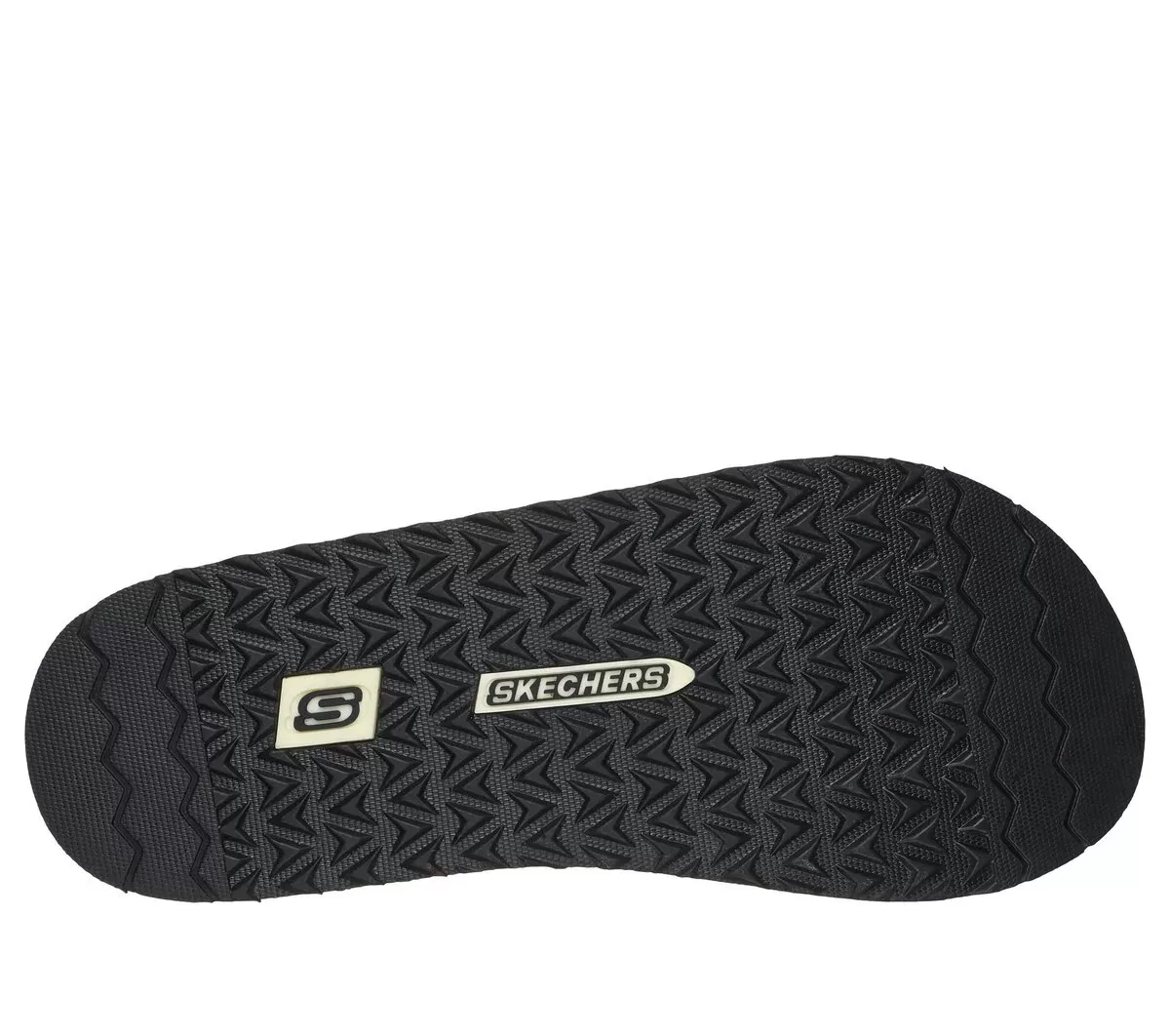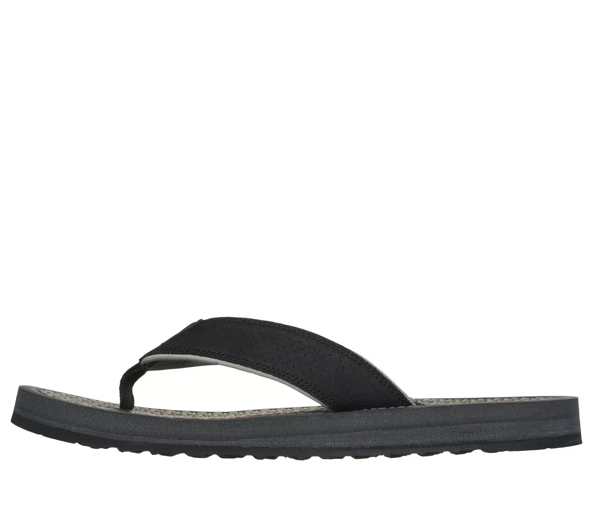 Opnå afslappende nirvana med Skechers Relaxed Fit®: Tantric – Copano. Denne rummelige 3-punkts string-sandal har en perforeret overdel i imiteret læder med en kontureret Luxe Foam® fodseng.