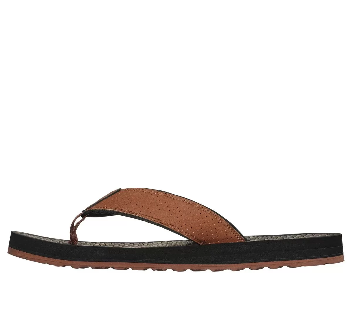 Opnå afslappende nirvana med Skechers Relaxed Fit®: Tantric – Copano. Denne rummelige 3-punkts string-sandal har en perforeret overdel i imiteret læder med en kontureret Luxe Foam® fodseng.